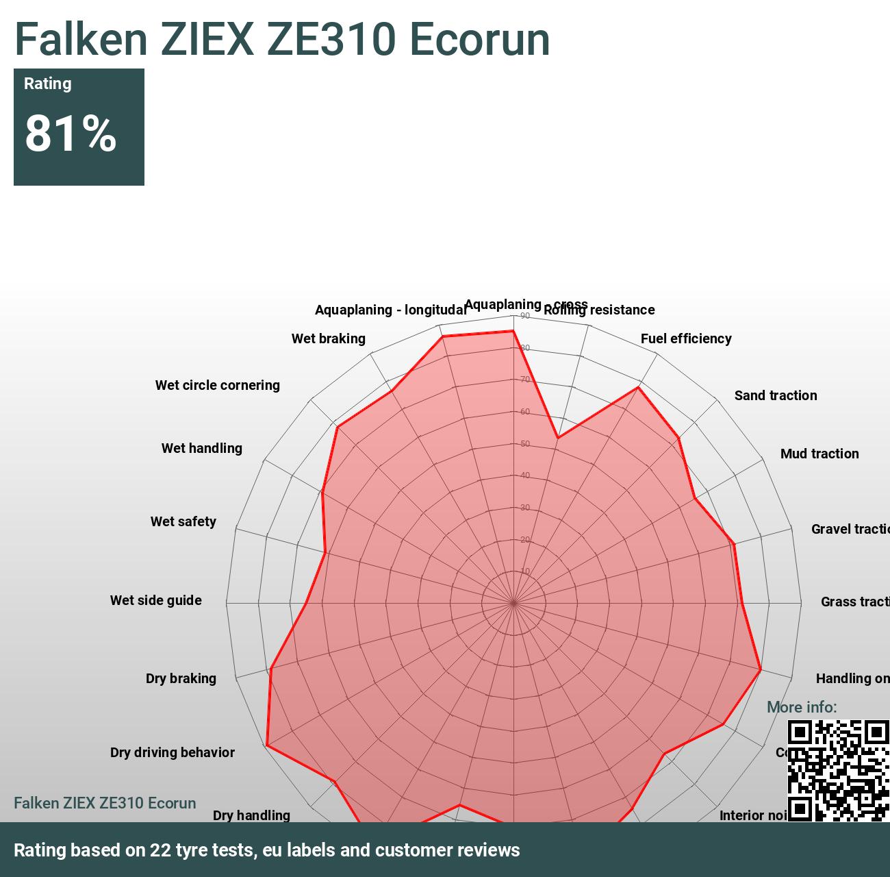 Het behalen van een eervolle 3e plaats van de 12 in zijn categorie, heeft de Falken ZIEX ZE310 Ecorun indruk gemaakt met zijn prestaties en een 'Uitstekende' eindscore behaald. Deze band toont uitstekende off-road handling en dynamische capaciteiten, vergezeld van robuuste aquaplaning weerstand en veilige droge handling, te danken aan zijn goede terreinkwaliteiten. Hoewel het kortere remafstanden biedt, een opmerkelijk aspect van zijn prestaties, vertoont het wel een gematigde zijdelingse grip op natte oppervlakken. Uniek onder zijn sterke punten is zijn ongeëvenaarde prestaties op grindtractie, waarmee het zich onderscheidt in deze specifieke discipline.